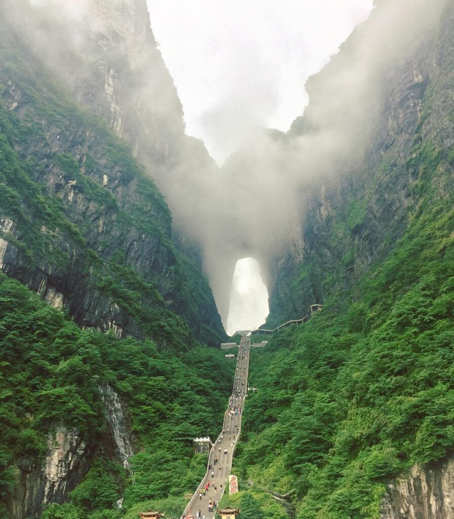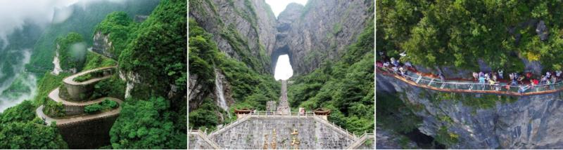 ngưỡng cung đường nguy hiểm nhất thế giới với 99 khúc cua ngoạn mục thu nhỏ trong tầm mắt, nơi đây cũng là nơi nhiều lần biểu diễn máy bay xuyên động Thiên Môn và đua nhảy dù quốc tế. Khi lên tới đỉnh của Thiên Môn Sơn, Quý khách sẽ đi theo con đường bao quanh những đỉnh núi, xuyên từ đỉnh núi này sang đỉnh núi khác. Một bên là núi, một bên là mây, thỉnh thoảng có thêm những lá bùa may mắn màu đỏ rực rỡ sẽ khiến Quý khách cảm thấy lạc như lạc vào chốn bồng lai tiên cảnh, như đang đi trên 9 tầng mây của thiên đường