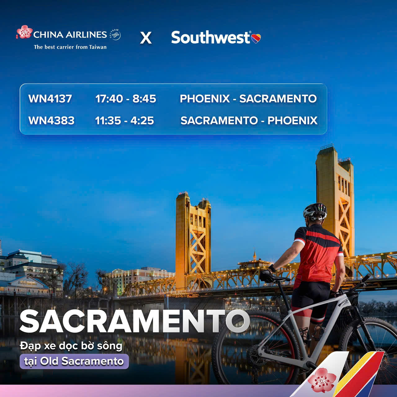 🌇 Sacramento (SMF): Tận hưởng nhịp sống chậm rãi bằng cách đạp xe dọc bờ sông American và khám phá vẻ đẹp lịch sử của khu Old Sacramento đầy hoài niệm.