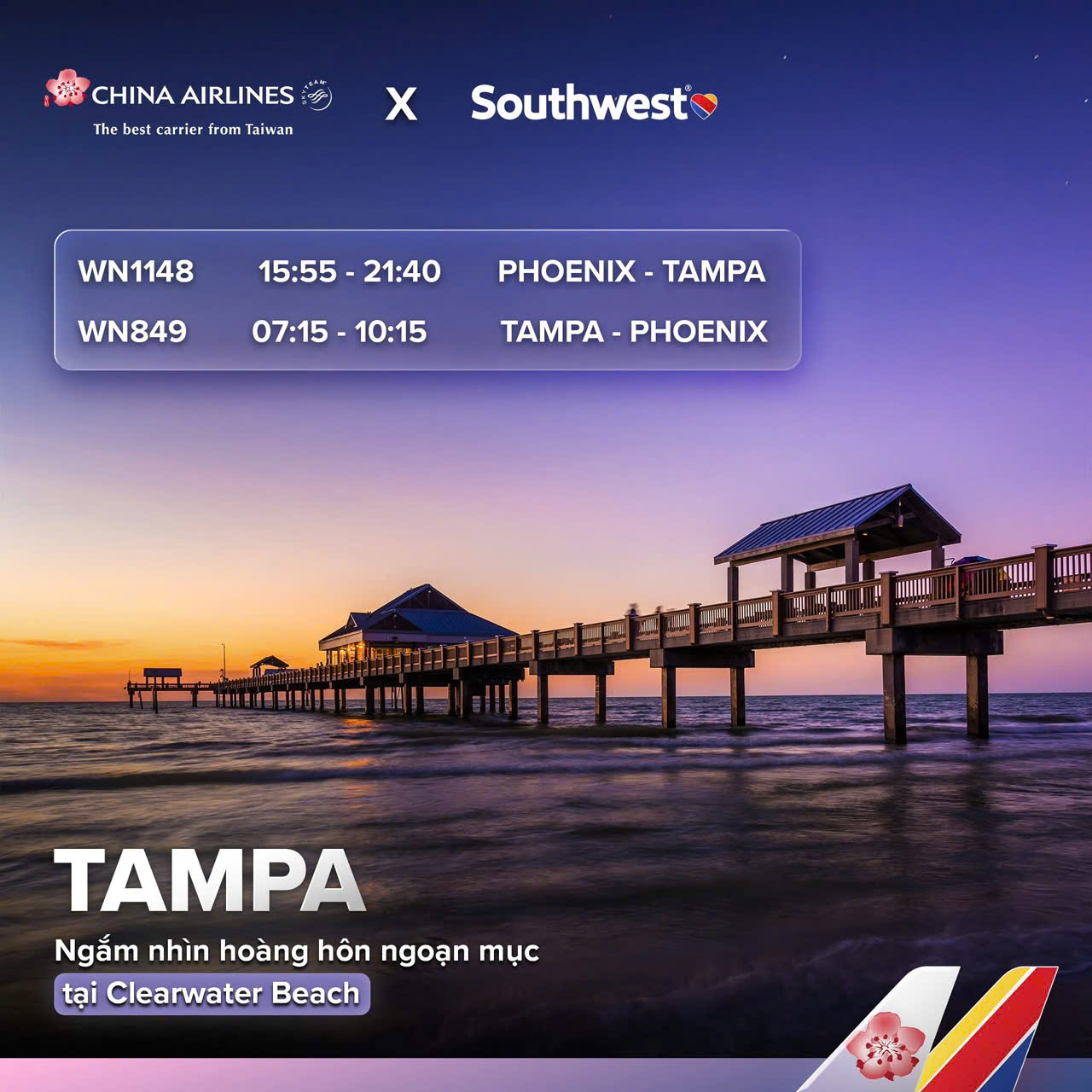 China Airlines mang đến trải nghiệm bay quốc tế đẳng cấp, kết hợp cùng mạng lưới nội địa rộng khắp của Southwest Airlines, giúp hành trình đến Mỹ của bạn trở nên liền mạch và trọn vẹn hơn bao giờ hết.